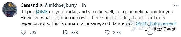 而《大空頭》電影里的原型Michael Burry,今天也猛烈抨擊這些共謀抬高游戲驛站股價、擠壓空頭的短線交易者,并@了SEC呼吁進行調查。