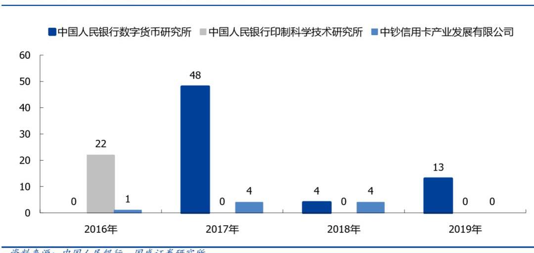 央行研究法定數字貨幣已久,推出在即。中國人民銀行自2014年起開始研究法定數字貨幣,2019年底,《財經》稱,中國央行數字貨幣正在深圳試點,即將步入生活應用場景。2020年1月,央行稱已基本完成法定數字貨幣頂層設計、標準制定、功能研發、聯調測試等工作,4月更表態稱要堅定推薦DCEP研發。我們在前兩篇DCEP專題報告中分析了DCEP的定位和對電子支付產業的影響,本篇聚焦于央行專利。根據我們的統計,自2016年,央行旗下的3家機構已為數字貨幣申請97項專利,從中可以發現: