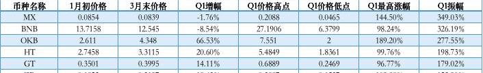總體而言,OKB在Q1整體漲幅最高,達到66.53%,遙遙領先HT以及ZB;Q1暫時落后的是BNB。