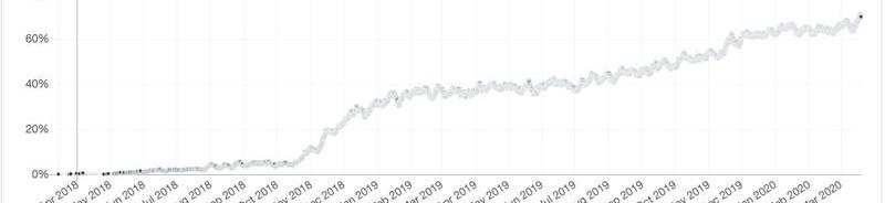 根據Asicboost.dance網站的最新數據,Asicboost的使用率從那以后節節攀升,從滲透率不足5%上升到現在的接近70%,即全網近3/4的礦機都在“開外掛”。