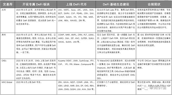 不可否認,交易所在加密行業扮演著重要的角色,行業內很多資源都集中在交易所,而第一波DeFi崛起浪潮給交易所差異化發展提供了空間,一些頭部加密貨幣交易所開始DeFi融入自身的生態和未來發展,并希望利用超前部署優勢進一步便鞏固或發展自身的核心競爭力。事實上,對于交易所而言,不僅有能力、有資源去推動DeFi市場發展,更需要去承擔一份責任,在為DeFi提供流動性的同時,也要讓更多用戶了解甚至參與DeFi項目發展。那么,那些頭部加密貨幣交易所在DeFi“第一春”這段時間里究竟有哪些布局呢?讓我們通過下面這張圖表來了解一下:?