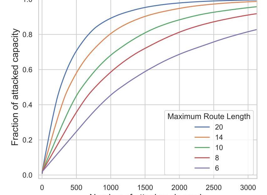 當使用一種貪婪算法以選擇路線并使盡可能多的流動性癱瘓時,我們得到以下結果。下圖顯示了我們設法癱瘓的閃電網絡當前鎖定的總容量的一部分。