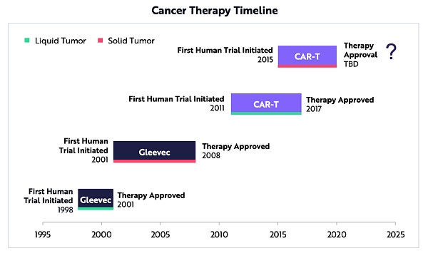 美國食品和藥物管理局(FDA)經過10年試驗后批準了口服化療藥格列衛Gleevec,其中7年用于實體腫瘤。這表明,FDA可能會在2025年批準首個用于實體腫瘤的CAR-T療法。