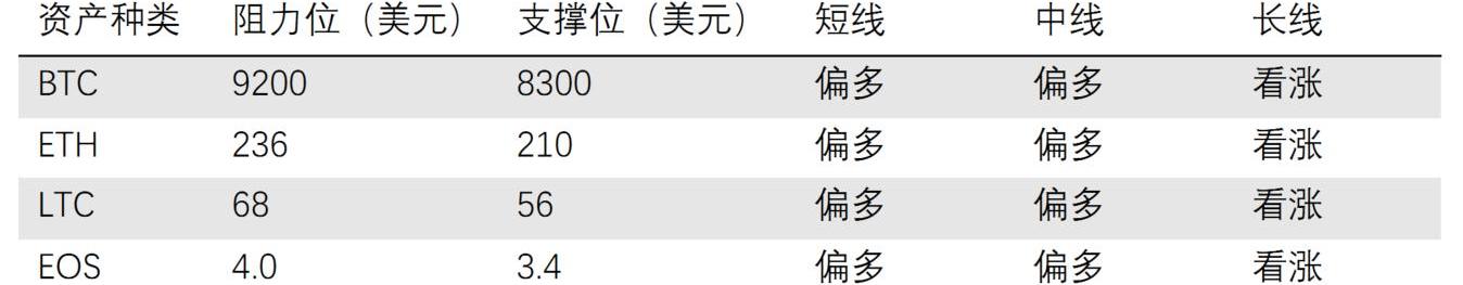 BTC長期趨勢轉好,未來一至兩年有望迎來瘋牛行情。智能合約平臺龍頭ETH、山寨幣龍頭LTC、DPoS龍頭EOS可逢低配置。