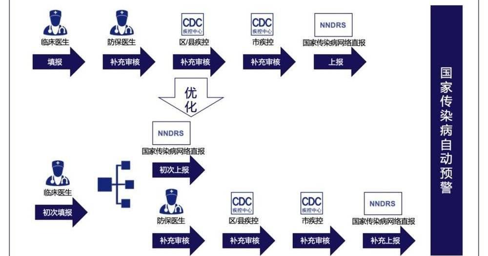 國家傳染病上報是在臨床醫生發現并填報傳染病報告卡后,通過醫院審核—>區CDC審核—>市CDC審核—>三級數據交換平臺—>國家直報系統的逐級匯總的方式;匯總層次多,人工補充數據和審核流程麻煩——這用于日常數據管理還行,應對突發傳染病流行就捉襟見肘了。