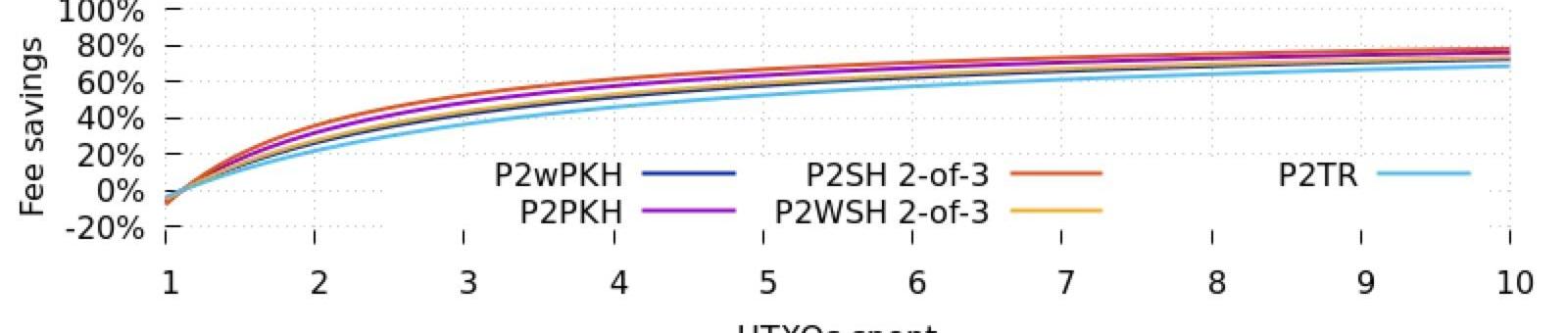 如上所示,通過同時合并額外UTXO所節省的金額并不是特別大,因此即使你不注意合并大小,也可以獲得合理的效率。