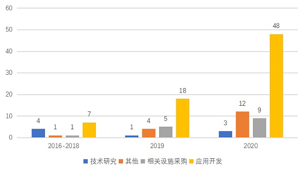從年份角度來看,除技術研究類項目數有所浮動外,設施采購、應用開發和其他類項目數均呈逐年上升趨勢,且應用開發類始終是占比最高的。