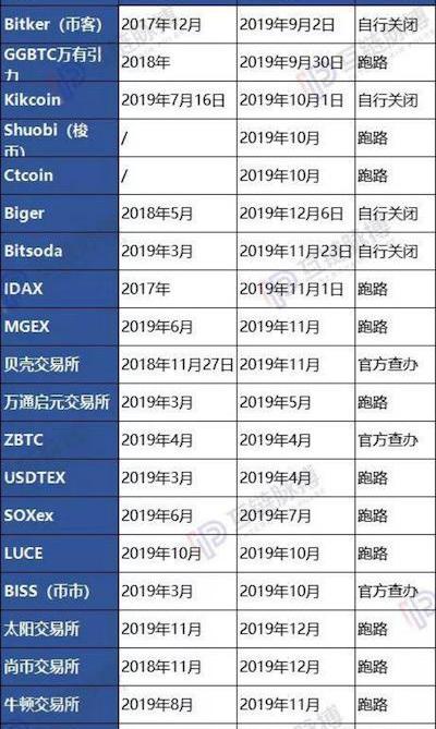 互鏈脈搏研究院數據顯示,2019年,至少有20家小有名氣的交易所跑路或自行關閉服務。