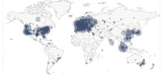 下圖顯示了截至2020年1月5日的11271個BTC區塊鏈全節點的分布:
