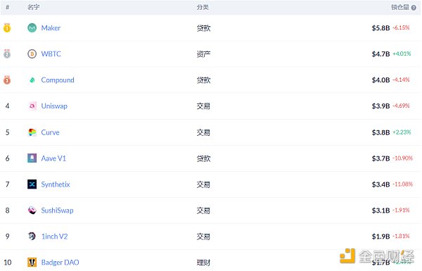 DeFi項目鎖定資產前十排名及鎖倉量,數據來源:Debank