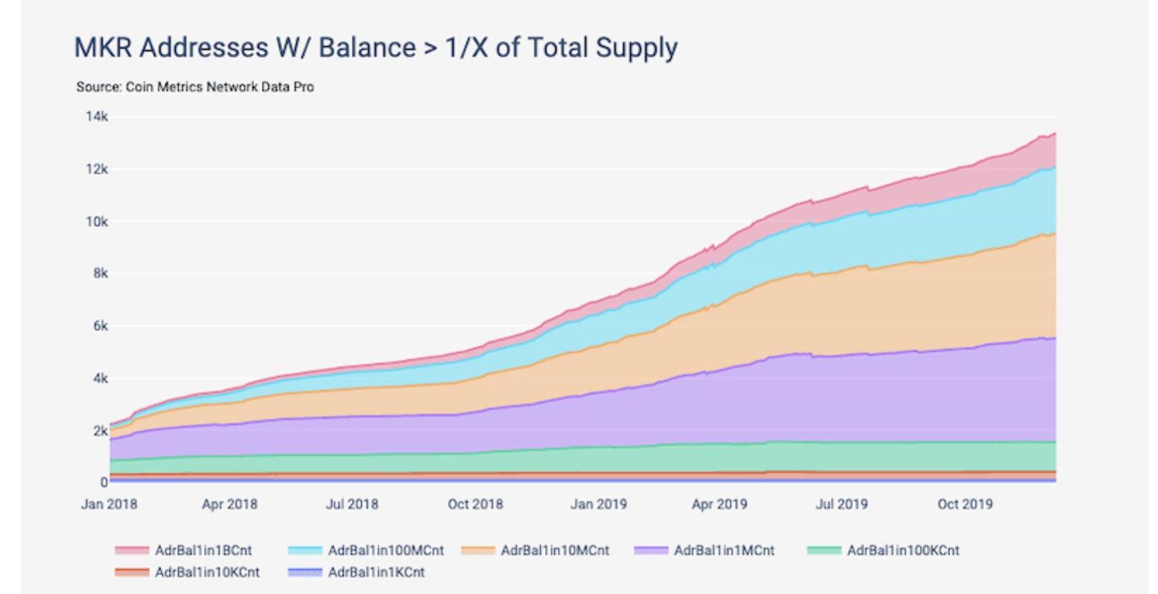 下表顯示了至少持有MKR總供應量1/X的地址的統計信息,其中X的范圍為一千到十億。