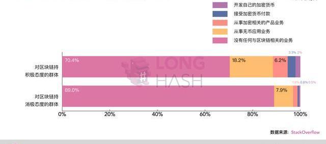 意料之中的是,對區塊鏈持積極態度的開發人員更有可能在從事與區塊鏈相關項目的公司工作。其中29.7%的人表示他們的公司在從事與區塊鏈或加密貨幣相關的業務,而在對區塊鏈持消極態度的開發者中,只有11%在涉足區塊鏈項目的公司工作。
