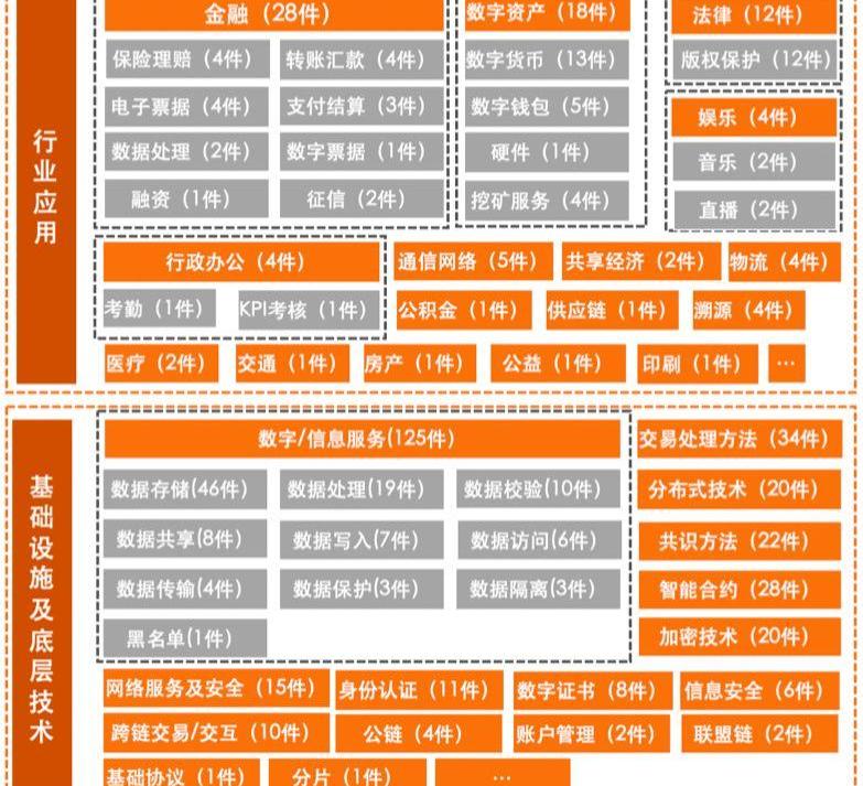 根據零壹智庫發布的《全球區塊鏈專利報告》,中國70%區塊鏈國際專利與基礎設施和底層技術有關。按照區塊鏈產業鏈圖譜,可將區塊鏈專利分為2大類,行業應用層和基礎設施及底層技術層。