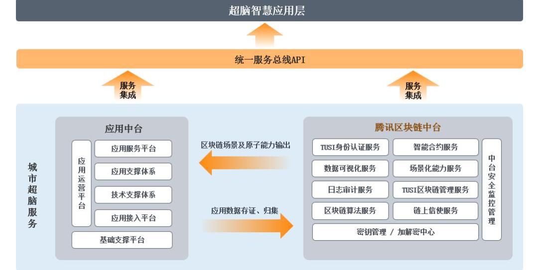 在城市超腦建設中,騰訊TUSI區塊鏈中臺匯集區塊鏈技術的基礎能力、業務能力,實現業務中臺和區塊鏈中臺打通。例如,建設信用數據共享平臺,通過建立數據索引幫助,在信用數據管理中對數據進行確權,促進數據流通。以服務化形式輸出到應用中臺,提供區塊鏈一站式構建服務、管理服務、場景化能力服務。