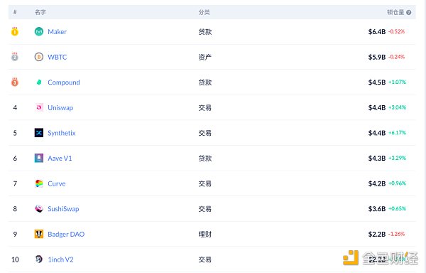 DeFi項目鎖定資產前十排名及鎖倉量,數據來源:Debank