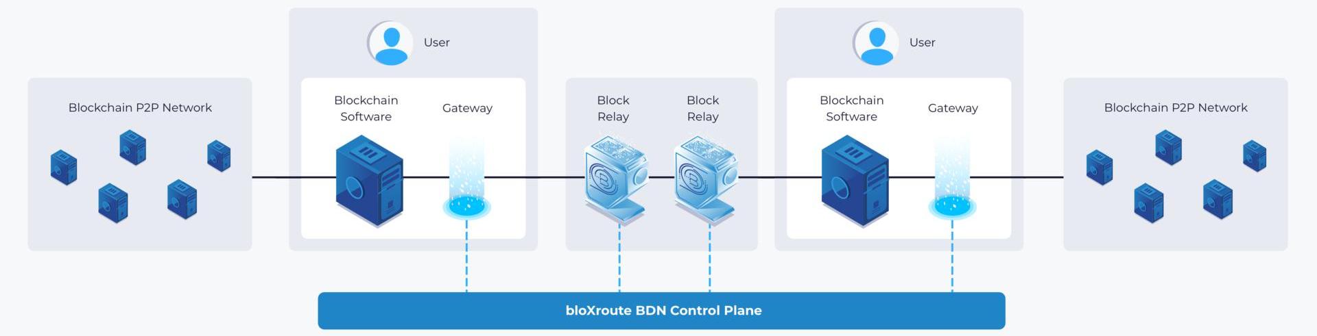 Bloxroute通過在全球部署服務器構造了一個高吞吐,低延時的網絡,這個網絡中的服務器被稱為中繼,這個網絡經過優化,可以快速的傳播區塊鏈中的交易和區塊。為了讓區塊鏈的節點和這個網絡通訊,還開發了一套網關軟件,可以讓區塊鏈中的消息和BDN的協議進行交互。具體如下圖所示: