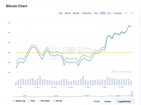 與目前的金融理財產品不同的是,比特幣是一種基于全球共識,并伴隨著高風險、可能會帶來高倍收益的資產。據加密行情數據網站 CoinMarketCap,自今年 1 月 1 日以來,比特幣價格從 29000 美元,漲到了如今近 52000 美元,漲幅近 80%,收益表現優于大部分投資標的。