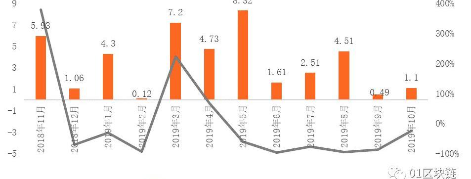 圖42018年11月至2019年10月中國區塊鏈項目融資金額及變化