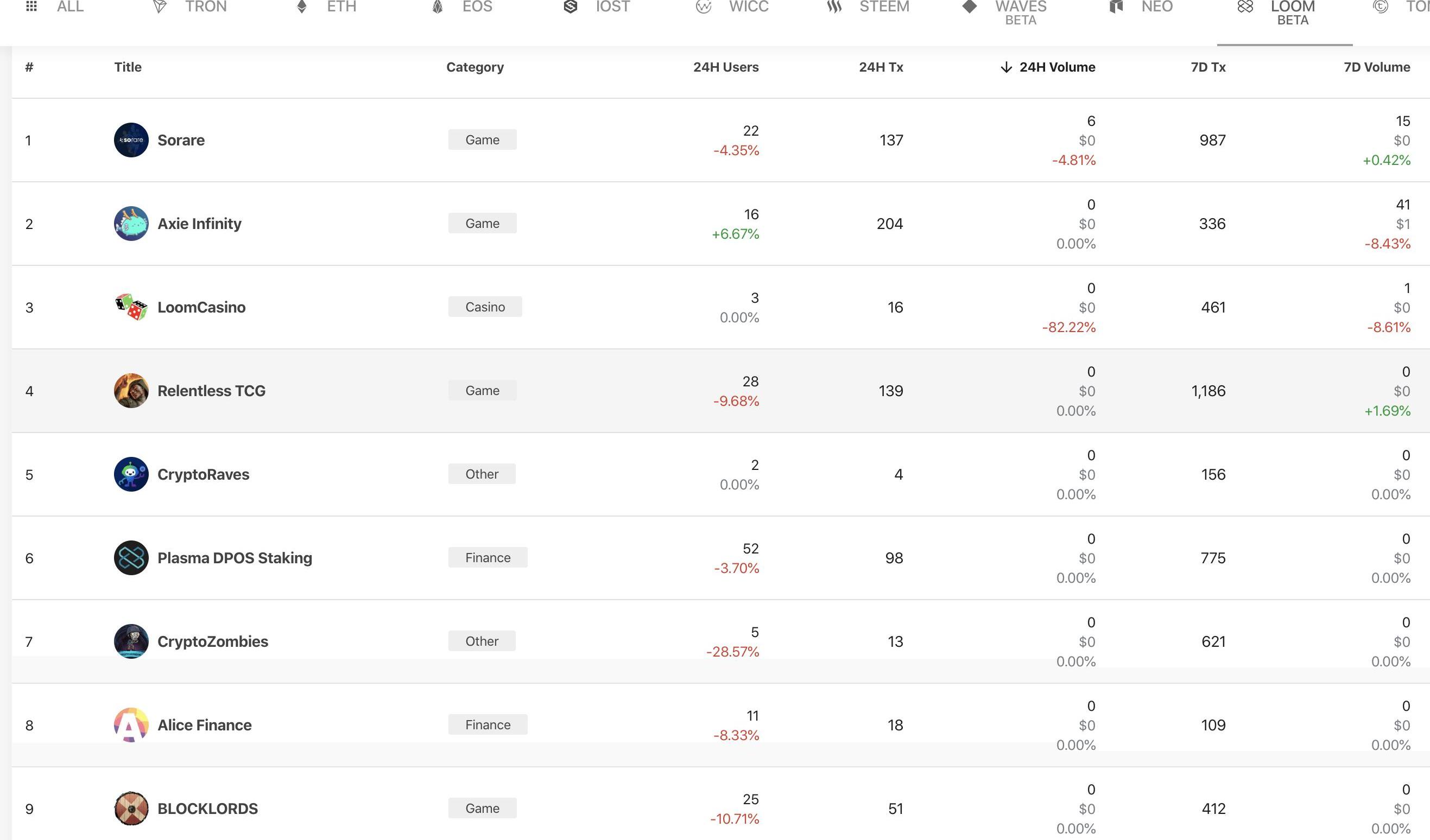 LOOM以替以太坊提供鏈游擴容方案為目的,進行了大量研發,詳見《V神看好的Plasma使用指南第一卷:游戲落地》。但尷尬的是,目前愿意使用LOOM解決方案的項目方很少,玩LOOM游戲的玩家更少。這就好比路修好了,車卻寥寥無幾,仔細一看車上還沒乘客,其凄涼程度在dapp.review上LOOMBeta數據中也可見一斑。