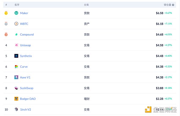 DeFi項目鎖定資產前十排名及鎖倉量,數據來源:Debank