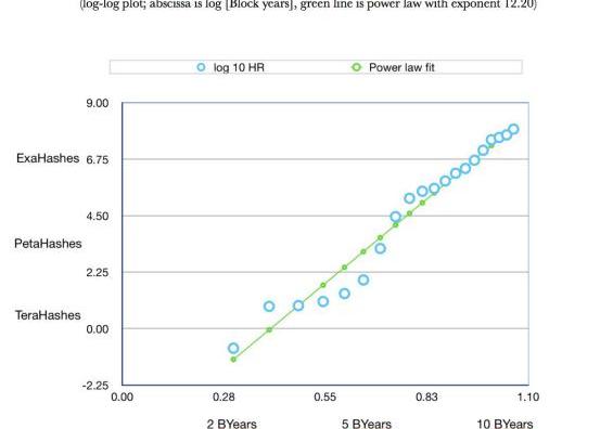 兩個指數關系:HR=c*exp其中HR是哈希率,Byr是經過的塊年數,a和c是參數,以及冪律關系:logHR=c+a*logByr。