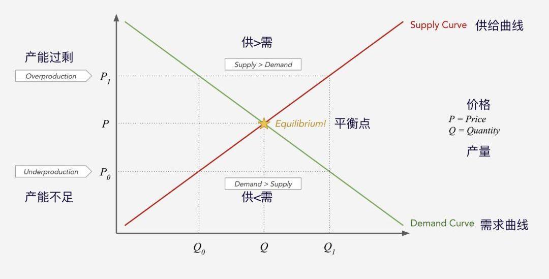 當供應與需求相匹配時,市場處于平衡狀態。當價格超過此平衡點時,供給Q1就大于需求Q0了,于是降價可以讓市場再次達到平衡,而當價格跌至平均水平時,產能不足Q0,而需求很強烈,價格就會被推高。