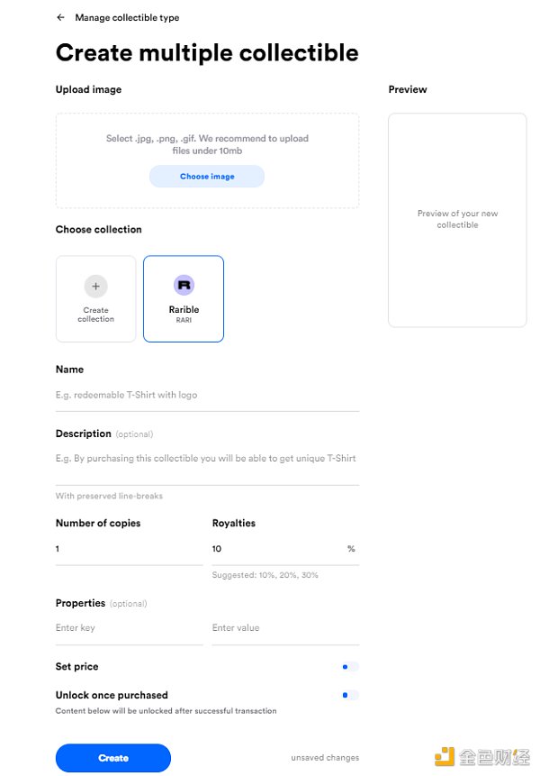 Rarible支持的是ERC1155標準,因此你可以選擇你的NFT是一個copy還是多個copy的。