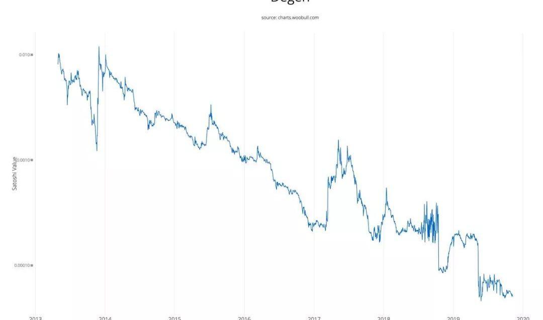 下圖中以域名幣NMCBTC的價格變化曲線為例,可以很明顯地看到,它的價格在2013年至2019年間不斷下滑。據WillyWoo的推文,除了NMCBTC之外,還有超2000種山寨幣也出現了類似的“衰變”,在一段時間內,他們的價格都直線般地下降。