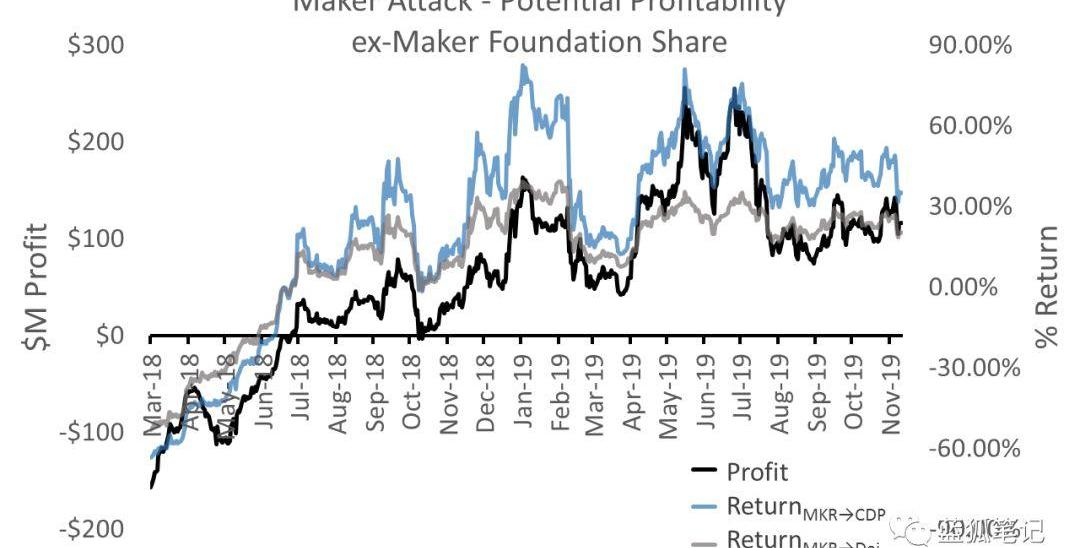 截止至2019年11月5日,這些抵押資產價值C=3.36億美元,MKR市值M=5.55億美元,Dai市值D=9600萬美元。這產生了潛在的攻擊收益:
