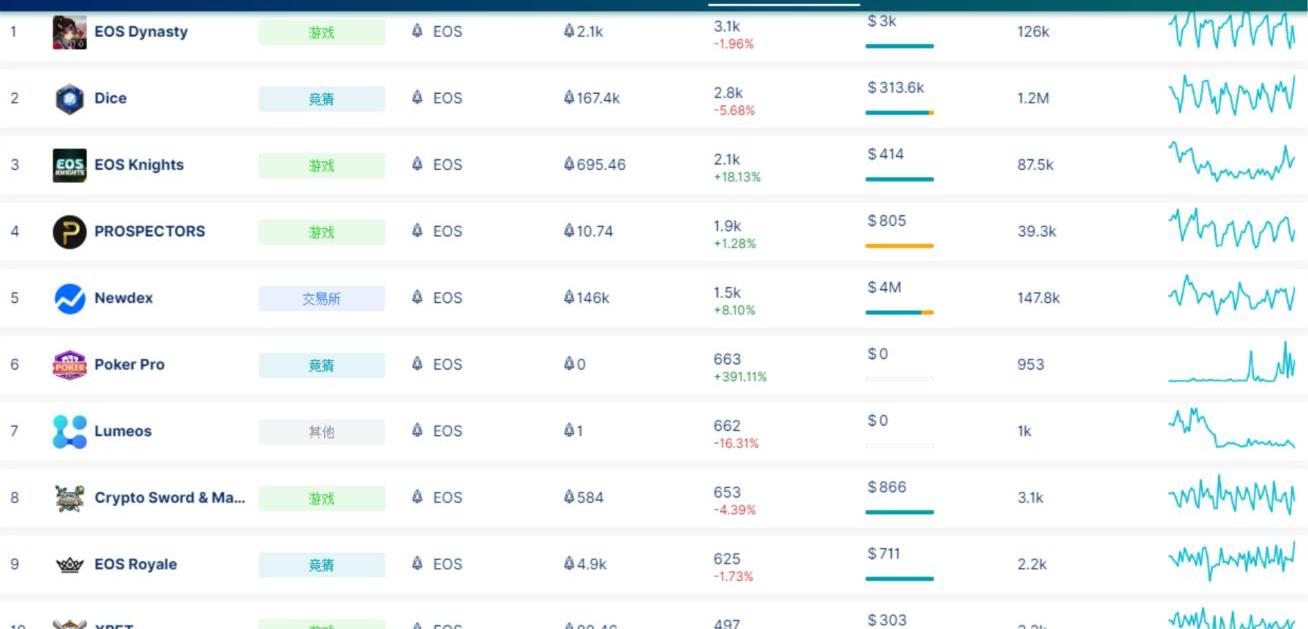 據DappRadar統計數據,24小時EOSDApp整體活躍程度有所回落。游戲EOSDynasty的24小時用戶數3.1k,較昨日變化-1.96%;競猜應用Dice的24小時活躍用戶數2.8k,較昨日變化-5.68%;交易應用Newdex的24小時活躍用戶數1.5k,較昨日變化+8.10%;數據應用Lumeos的24小時活躍用戶數662,較昨日變化-16.31%。