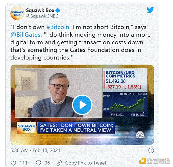 比爾·蓋茨(Bill Gates)在周四接受CNBC采訪時表示,他對比特幣持“中性看法”,但他確實認識到降低資金轉移成本的重要性。蓋茨說:“我沒有比特幣。我沒有做空比特幣。”他表示,數字化資金和降低交易成本是“蓋茨基金會在發展中國家所做的事情”。他還說,基金會的重點是撤銷指控,增加透明度,而不是保護匿名性。蓋茨進一步指出,比特幣的波動是由“狂熱”驅動的,而且很難預測價格將如何發展。