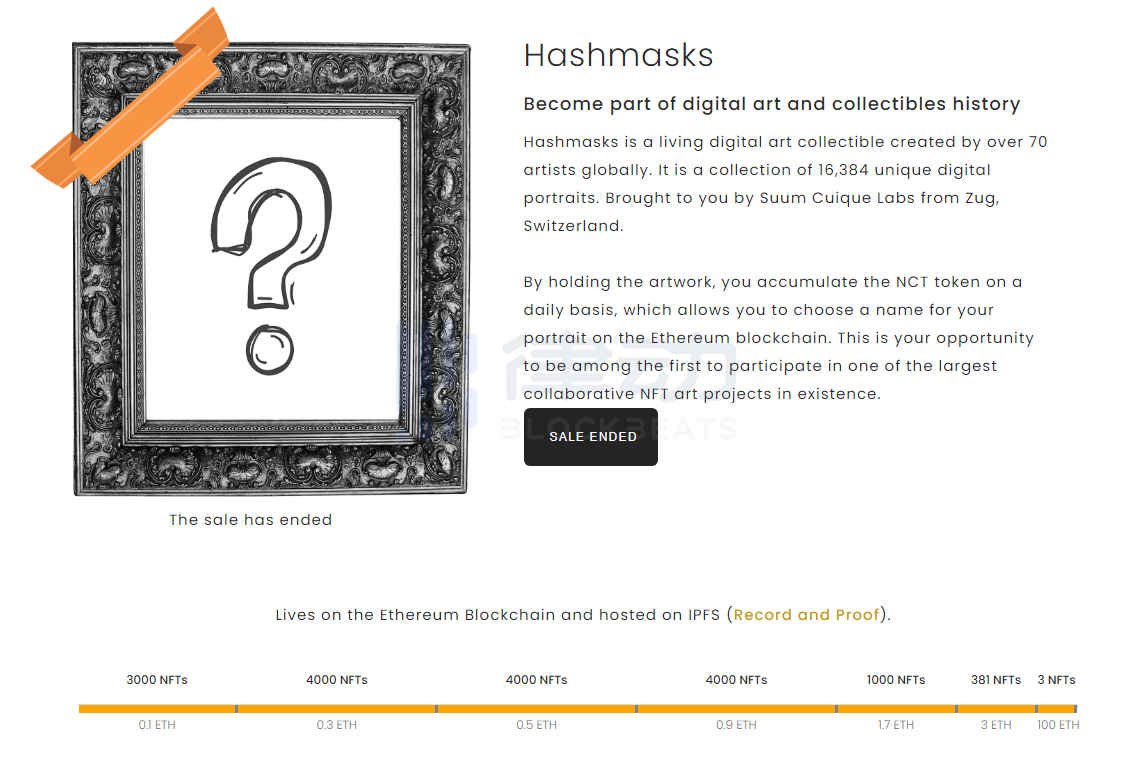 Hashmasks 只有 16384 個,它們的銷售形式是先以 0.1ETH 的價格出售特定數量的 NFT,然后售價會隨著出售數量的增加而增加。