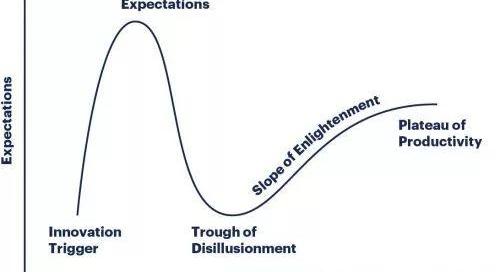 這種模式是兩種力量隨時間變化的函數:炒作和成熟。想象一下一個鐘擺,其中炒作是使期望值上下波動的橫向力,而成熟度是一種引力,最終使期望值與現實保持一致。當期望值上升得太高而無法迅速地得到滿足時,擺錘會回落并且期望值會急劇下降。當成熟度較低時,期望值可能會劇烈波動,但隨著成熟度的增長,期望值則會變得更加溫和。