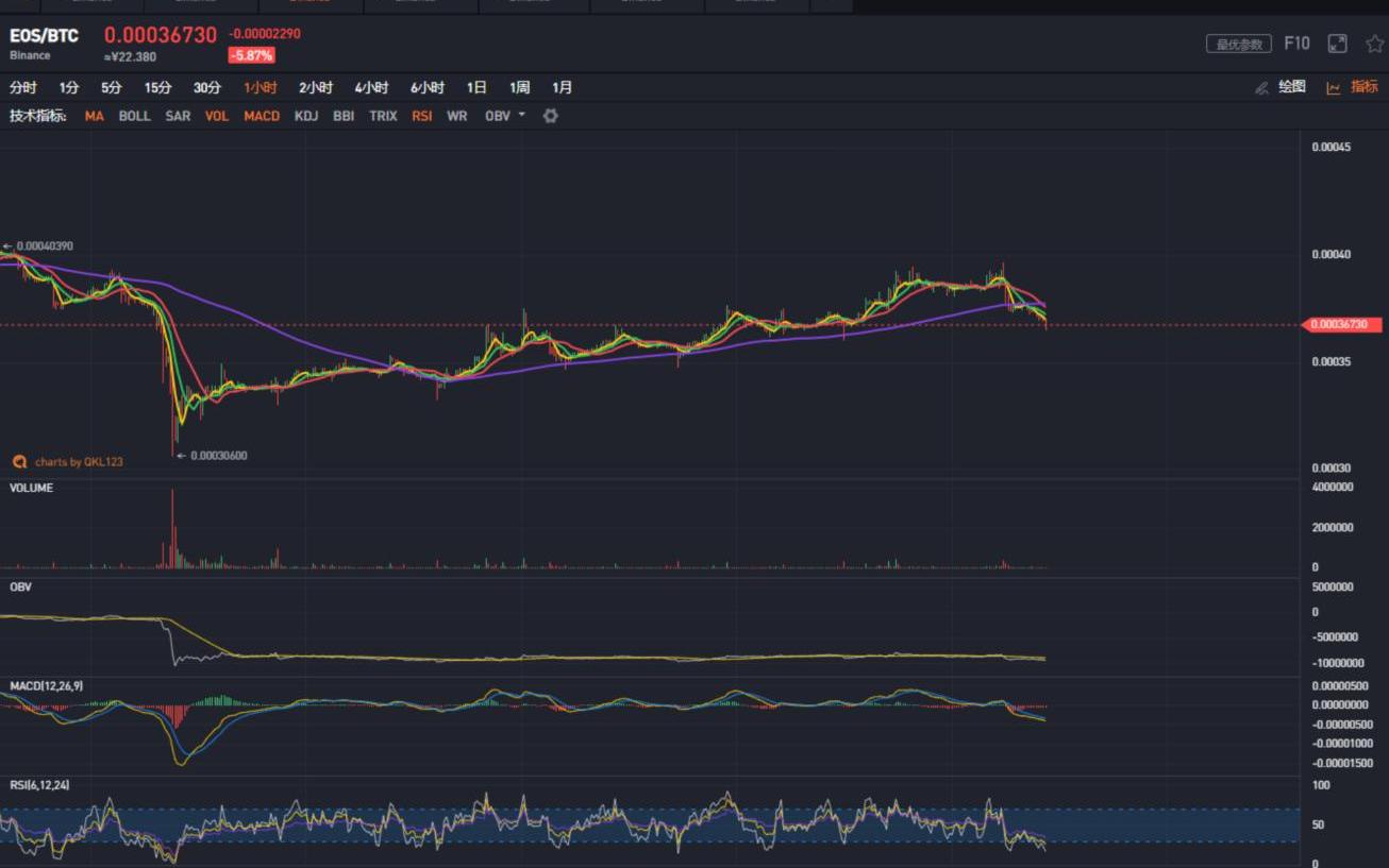 昨日晚間EOS/BTC交易對有所回落,目前回到前幾日的高點附近,短時表現由強較弱。