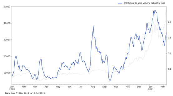 從衍生產品交易量的急劇增加來看,這種對期貨需求的增加變得更加明顯,尤其是對比2020年12月和2021年1月。該期貨指數衡量了自去年年初以來交易量增加的幅度。