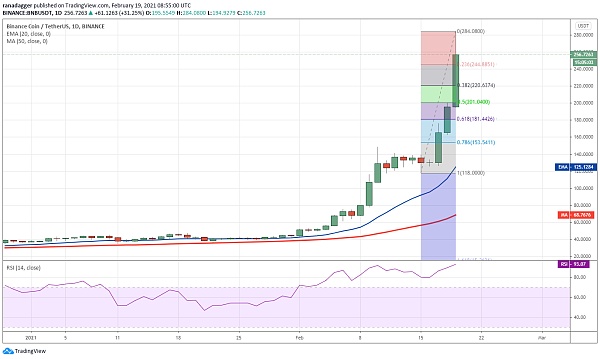 Binance Coin在2月份表現出色,市值排名第三。代幣已從2月1日的43.4331美元反彈至今天的盤中高點284.08美元,19天內上漲554%。垂直上漲已將相對強弱指數(RSI)推高至93以上,這表明BNB處于極度超買狀態。