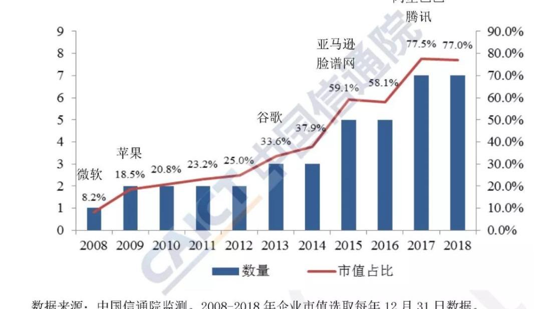 中國信通院資料顯示,平臺模式已成為企業生產經營的重要組織方式。2009年以前,全球市值Top10企業中僅為微軟一家平臺企業,到了2017年,這一數字升至7家,實現對傳統企業數量的反超。其中,蘋果于2009年,谷歌于2013年,亞馬遜和臉書于2015年,阿里巴巴與騰訊于2017年先后進入全球市值Top10榜單。統計顯示,2018年全球Top10上市企業中平臺企業市值比重已由2008年的8.2%上升至77%,規模達到4.08萬億美元,較2008年規模增長了22.5倍,成為全球經濟增長的新引擎。