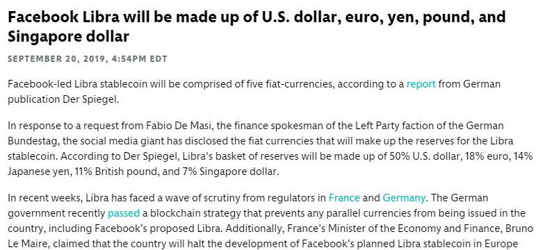 9月21日,Facebook在回復德國立法委員的一封信中,首次正式公布了Libra“一籃子貨幣”儲備金的構成:美元將成為支持Libra的主要貨幣,占比50%,其他由歐元、日元、英鎊和新加坡元組成。在此之前,一籃子貨幣的構成一直是市場密切關注的問題之一。