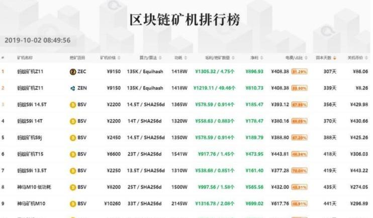 目前,回本天數排名前十的多數采用螞蟻S9系列,該系列礦機可以用于挖取SHA256算法的加密資產,除BSV之外,還包括BCH和BTC等。但是,螞蟻S9j挖取BSV的預期月凈利明顯低于雪豹礦機B1+(565.56元)和神馬礦機M10低功耗。