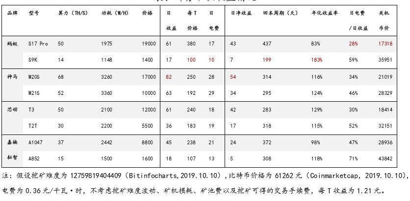 挖礦算力、難度上升,幣價下降,收益減少,“死亡分叉”再現,“礦難”風險臨近。9月,比特幣算力月初為77Eh/s,此后延續了2018年12月底以來的上升趨勢,26日,首次突破100Eh/s“大關”,逼近102Eh/s,10月2日回落至95Eh/s。與之相伴,比特幣挖礦難度亦不斷上升,從9月初的10.8T上升到了10月初的12.8T。然而,比特幣價格從月初的10575美元下降到了月底的8365美元。2018年12月至2019年7月長達8個月的幣價與算力齊飛的局面扭轉,挖礦難度上升與幣價下降使挖礦收益減少,拉長了礦機回本周期,回到了2018年1-12月的景象。考慮到11月枯水期即將來臨,豐水期低廉電價無以為繼,挖礦成本上升,如果這一“死亡分叉”趨勢延續,礦業或將再現2018年底部分礦機達到關機價格的局面。