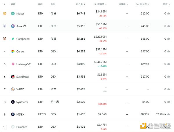 DeFi項目鎖定資產前十排名及鎖倉量,數據來源:Debank