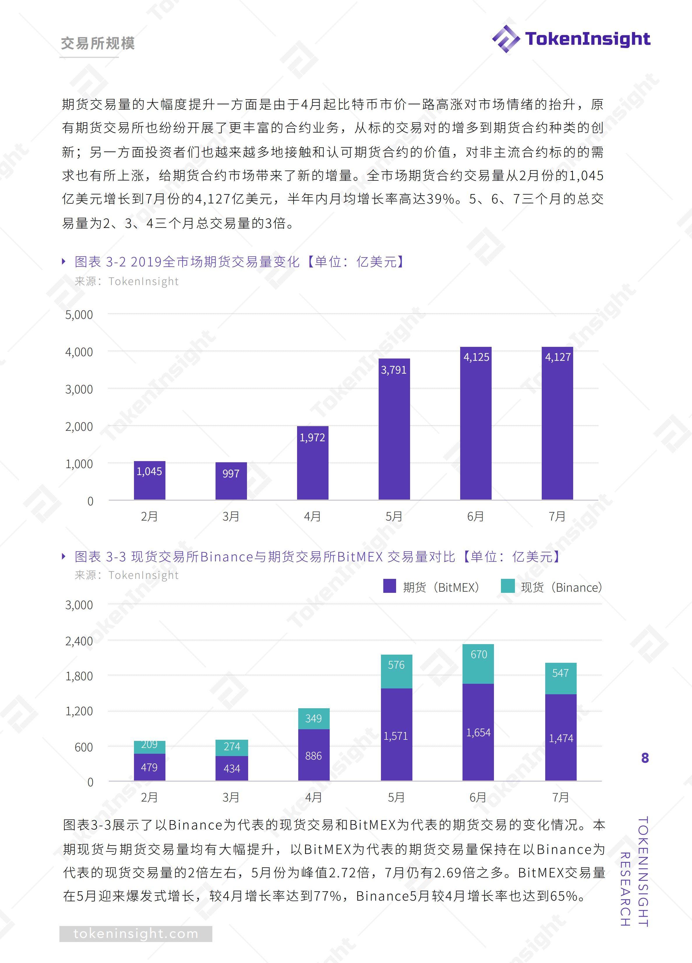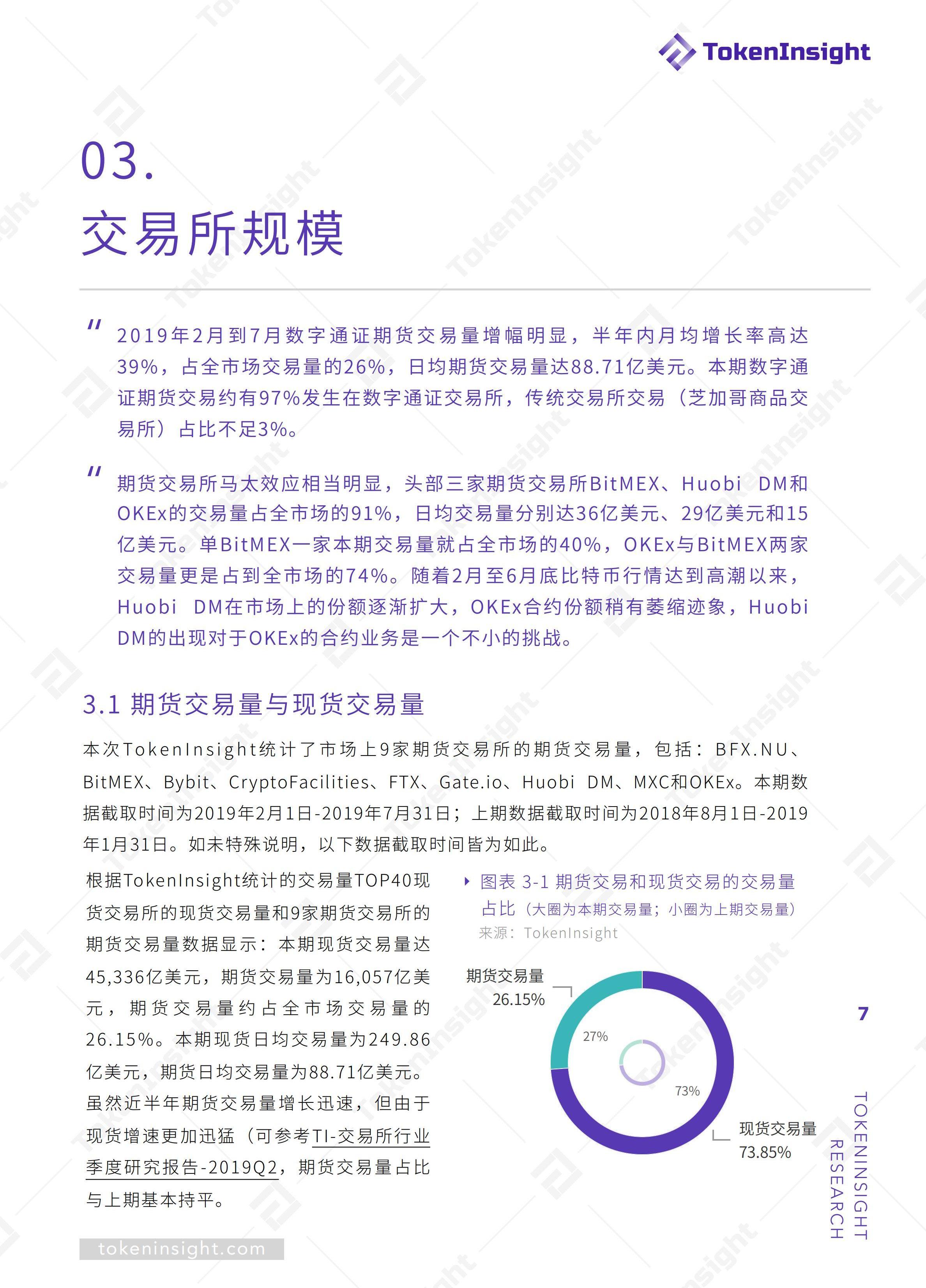 1.2019年2月到7月數字通證期貨交易量增幅明顯。全市場期貨交易總量達16,057億美元,占全市場交易量的26.15%,日均期貨交易量88.71億美元。