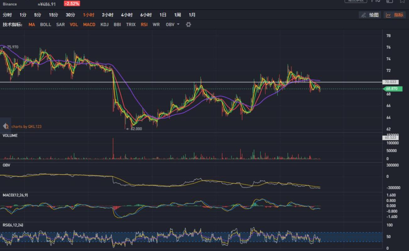 LTC回到前日的震蕩區間,目前在70美元附近小幅震蕩,短時有蓄力上攻的可能。LTC/BTC交易對震蕩下行,目前在0.0068BTC附近震蕩,表現相對弱勢。