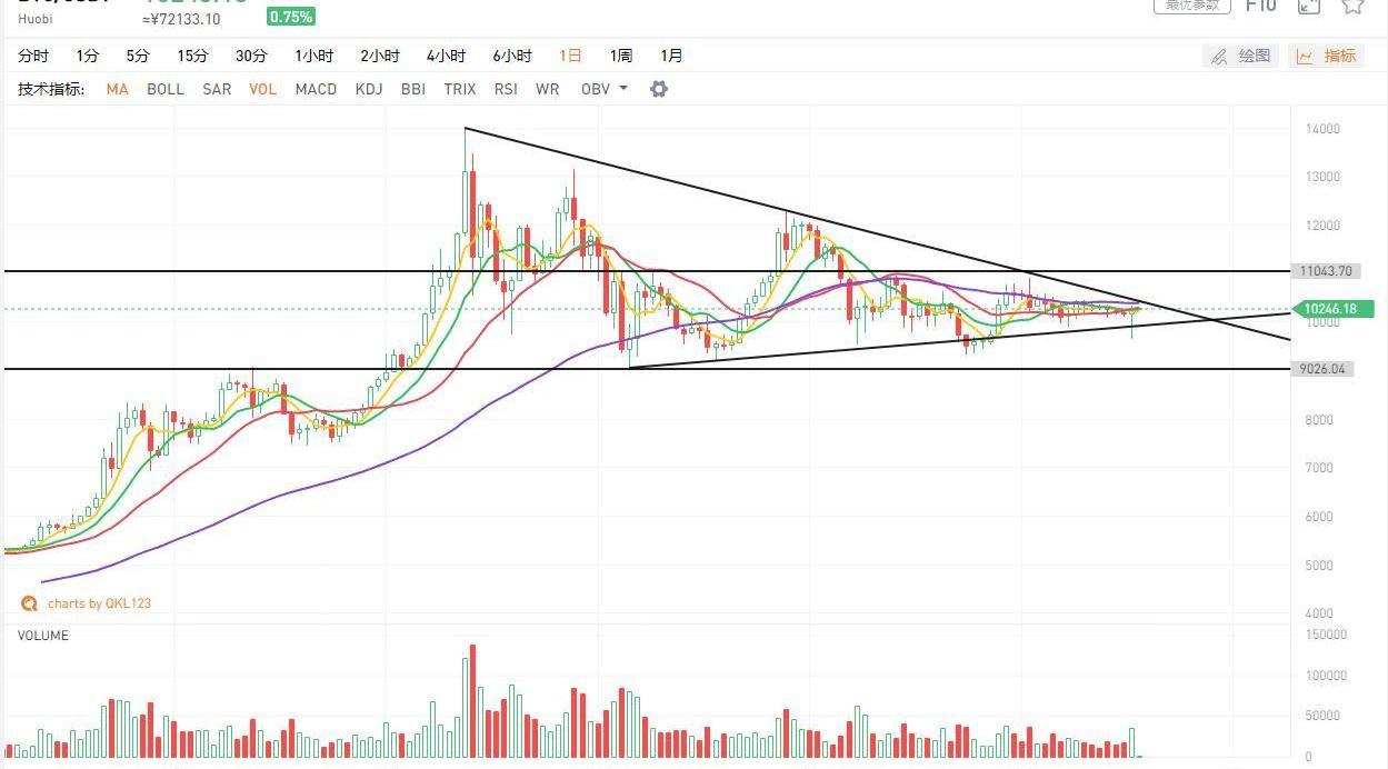 BTC昨天的走勢很嚇人啊,不過急跌之后又收了回來,在K線圖中留了一個長上影線,好似單針探底的走勢,我個人是不認可單針探底的,堅持中期調整的節奏不動搖,之前那么多利好該標的都沒有動,怎么會在利好兌現之后再度出現趨勢性拉升,這是不符合邏輯的,該標的能在這橫盤這么久,也足夠說明該標的的市場承接力還可以,但是接下來的幾天多空雙方將迎來關鍵時刻,是上是下也該出一個結果了,在整個超跌反彈中,該標的一直是橫盤應對,當超跌反彈結束時,我向就是該標的帶領市場向下尋底的開始,現在BTC已經來到了收斂三角形的末端,一般比較弱勢的情況下才會走到三角形的末端去選擇方向,我個人更傾向于向下走,繼續去完成中期調整的空間,該標的再度下破10000美元將會重新展開調整,下一目標位在7200-7500美元附近。