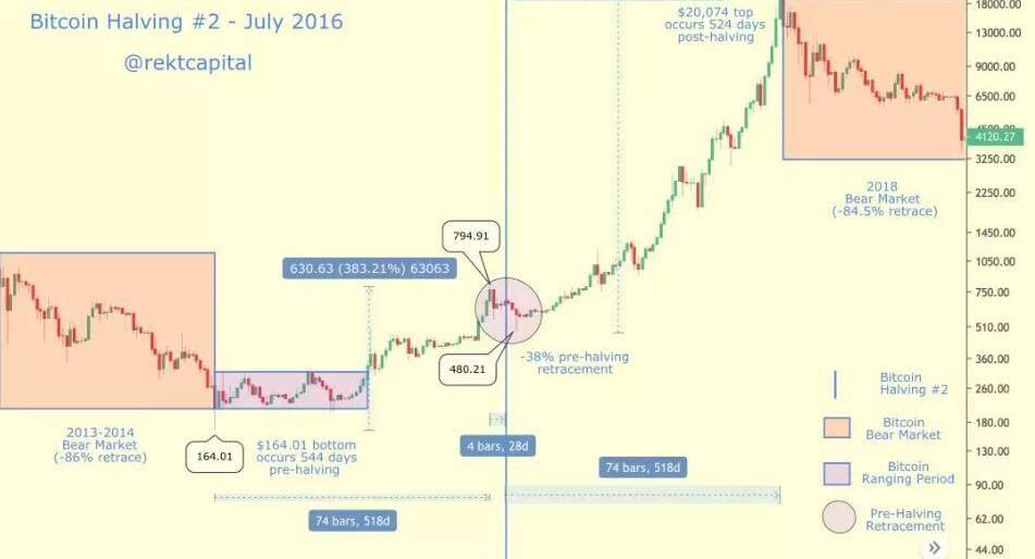 比特幣用了521天的時間才從底部反彈383%,達到了794.91美元高點,并在此之前下跌了一半。有趣的是,比特幣用了同樣的時間——大約524天才達到20000美元頂部。但第二次減半的減半前回撤與第一次完全不同,因為它:
