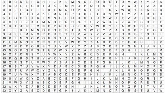 這是一個26X26的表格,第一行和第一列都是26個英文字母。第一行代表著原文信息,第一列代表著加密的鑰匙。兩者交匯就是密文。