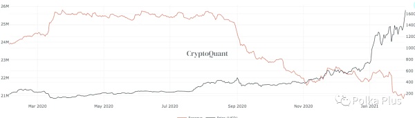 根據CryptoQuant的數據,截至11月底,交易所的ETH股票從2333萬枚暴跌至2080萬枚代幣。這意味著目前僅以太坊供應量的18.1%在交易所流通。
