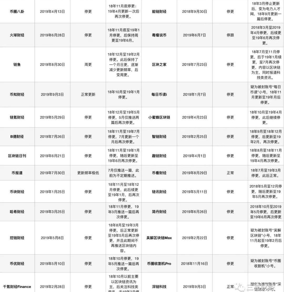 上表是三言財經統計發現的60家于今年停止更新的區塊鏈媒體公眾號,其中不乏有些圈子中較為知名的賬號,例如區塊鏈價值榜、dapdap區塊鏈等。