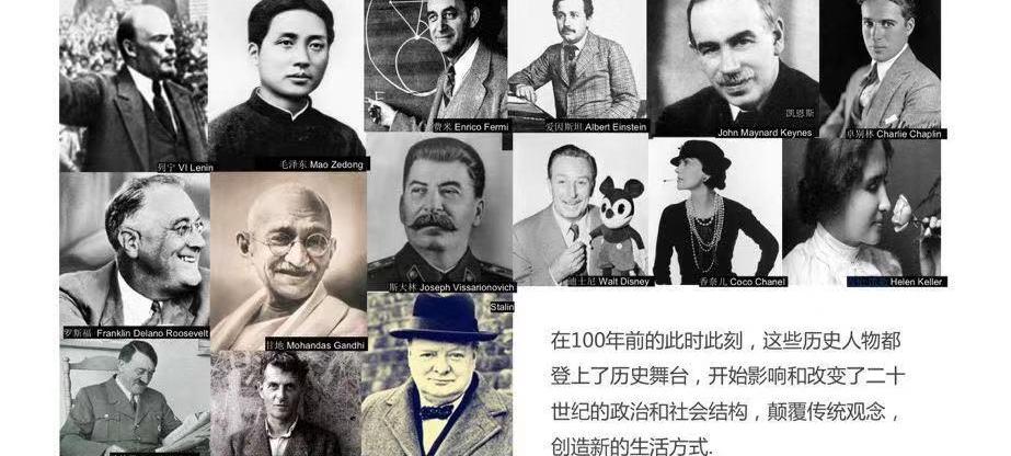 其中最有代表性的一個指標是,影響全球20世紀的與社會結構、哲學理念、科學技術、經濟學革命、文化藝術、生活方式的人物統統登上了歷史舞臺。他們基本上是那個時代的80后、90后、00后。例如,領域中的列寧、羅斯福、丘吉爾、毛澤東甚至希特勒;科學界的愛因斯坦;經濟學界的凱恩斯等等,都是那個時代的代表人物。