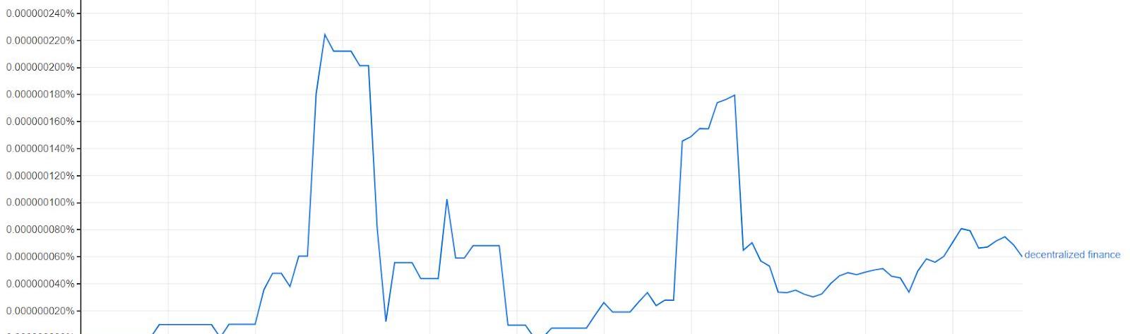 我在上面展現的是通過GoogleNgram搜索“DecentralizedFinance”的結果,以確定這個詞的來源。它的使用似乎起源于